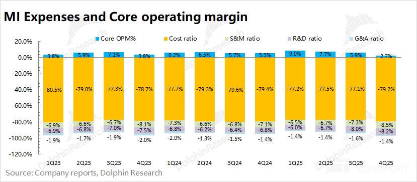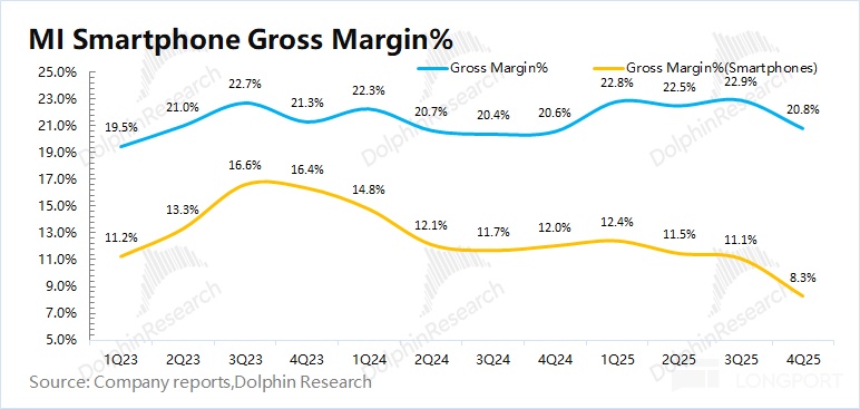 a) 小米老业务毛利率 20%,环比下滑 2.1pct,主要受国补收紧、存储涨价等影响,其中手机业务本季度下滑至 8.3%。