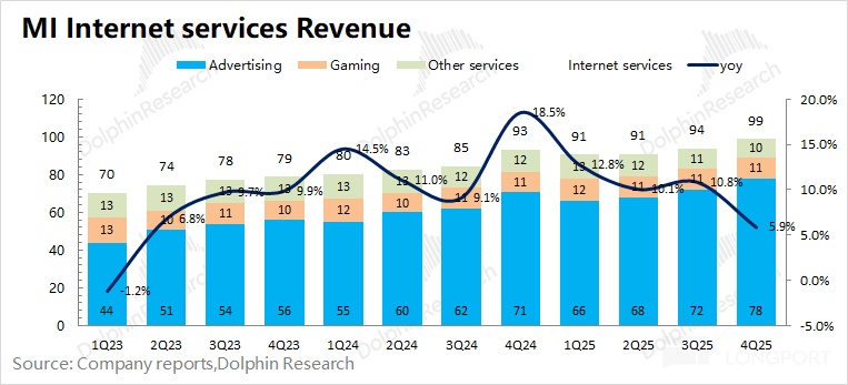 2025 年第四季度小米互联网服务业务实现营收 99 亿元,同比增长 6%。本季度主要的增长驱动还是在广告上:
