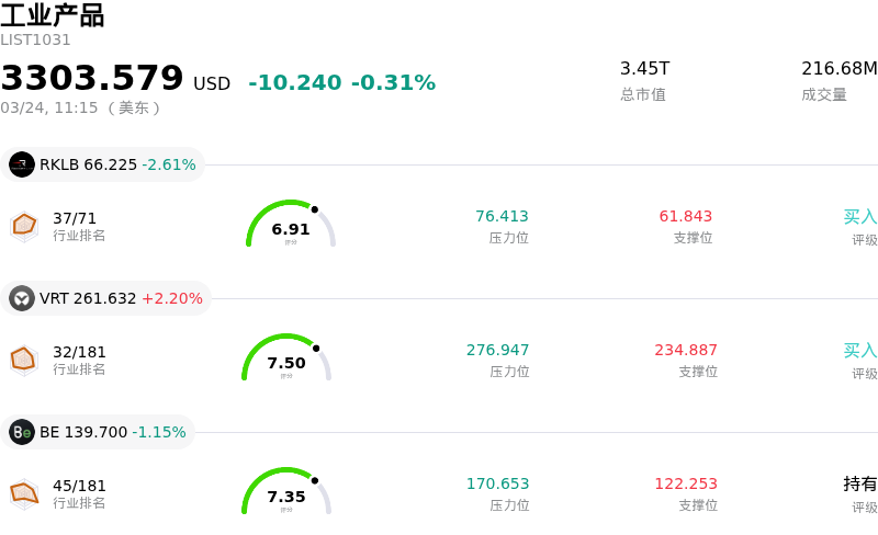 Caterpillar Inc (CAT) 盘中上涨5.01%, 所属行业工业产品下跌0.31% ,公司涨幅跑赢行业涨幅,行业成交额前三股票 Rocket Lab USA Inc (RKLB) 下跌 2.61%;Vertiv Holdings Co (VRT) 上涨 2.20%;Bloom Energy Corp (BE) 下跌 1.15%。