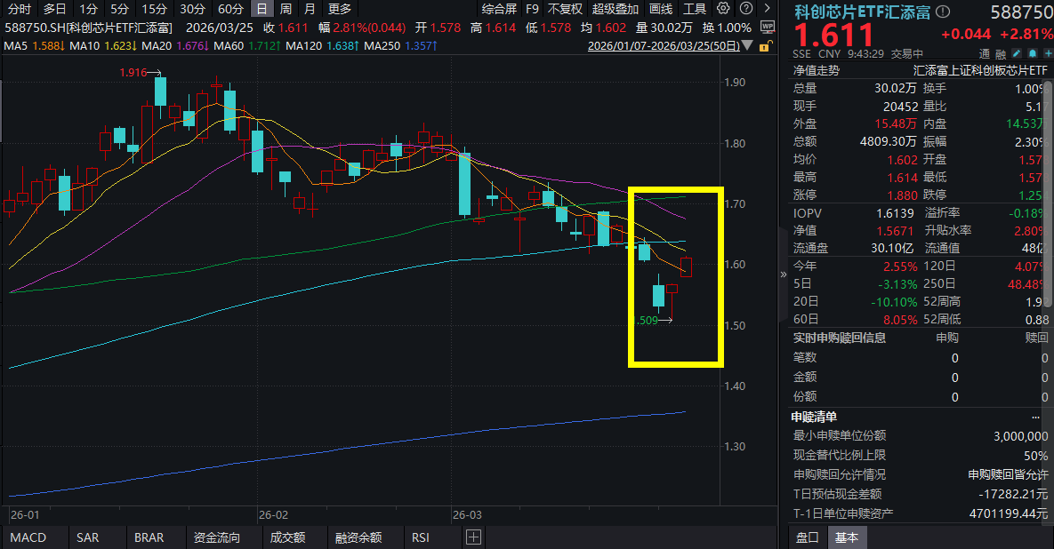 3月25日,A股市场延续回暖,科技板块冲高,截至9:43,科创芯片ETF汇添富(588750)涨2.81%,冲击两连阳,资金强势涌入,科创芯片ETF汇添富(588750)昨日吸金超7800万元。