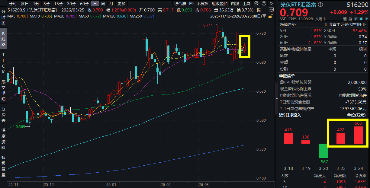 3月25日,A股市场延续反弹,沪指再度上涨超1%成功收复3900点,“算电协同”概念股井喷,新能源板块震荡回暖。同类规模领先、费率最低档的电池ETF汇添富(159796)涨超1%,盘中再度吸金超2700万元,此前已连续3日累计净流入超1.5亿元!费率最低档的光伏ETF汇添富(516290)涨超1%,此前已连续2日吸金