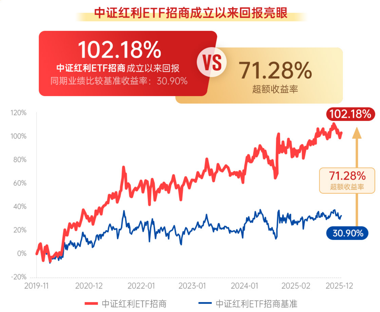基金定期报告显示,截至2025年底,中证红利ETF招商(515080)成立以来累计回报102.18%,相对业绩比较基准超额收益率71.28%。该ETF跟踪中证红利指数,前六大重仓行业为银行(21%)、煤炭(17%)、交通运输(13%)、有色金属(6%)、石油石化(5%)和基础化工(5%),周期属性资产合计占比约四成,“HALO”含量较高