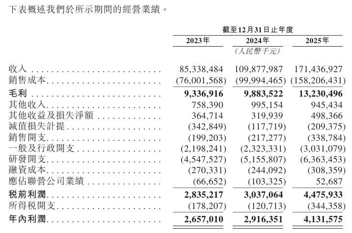 费用结构方面,研发开支是最大的投入项,2023年至2025年分别为45.48亿元、51.56亿元及63.63亿元,占收入比例从5.3%降至3.7%,绝对值持续增长但占比下降,体现规模效应。销售开支占比较低且保持稳定,2025年仅为0.2%。