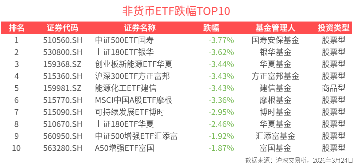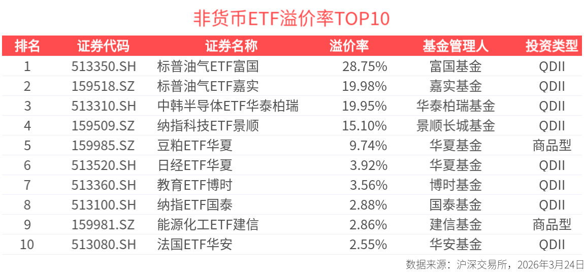 ETF英雄汇:黄金股ETF华夏(159562.SZ)领涨、标普油气ETF富国(513350.SH)溢价明显-20260324