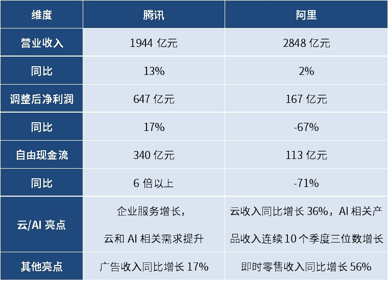 上周,腾讯与阿里相继交出最新一季财报。这轮财报最值得追问的,究竟还是利润修复,还是增长方向?如果只看单季利润表,两家公司表现并不相同;但把视角后拉一层,会发现更值得重视的共同点:以腾讯和阿里为代表的互联网大厂,正持续把资源投入到AI、云基础设施和新一代应用生态之中。