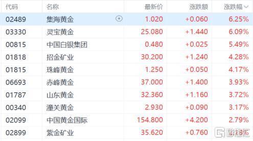 黄金股大涨,集海黄金、灵宝黄金涨超6%,中国白银集团涨超5%,招金矿业、珠峰黄金涨超4%,赤峰黄金、山东黄金等跟涨。