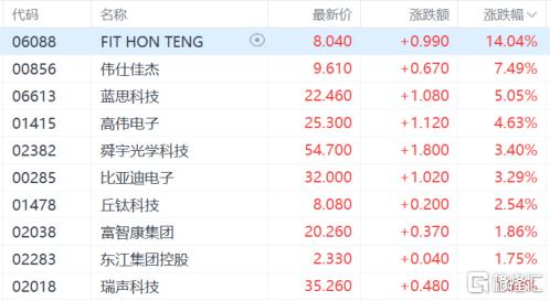 苹果概念股涨幅居前,伟仕佳杰涨超7%,蓝思科技涨超5%,高伟电子涨超4%,舜宇光学科技、丘钛科技等跟涨。