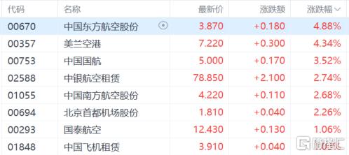 航空股表现活跃,中国东方航空、美兰空港涨超4%,中国国航涨超3%,中银航空租赁、中国南方航空等跟涨。