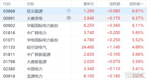 电力股走高,信义能源、大唐发电、华能国际电力股份涨超6%,中广核电力、华电国际电力股份涨超5%,哈尔滨电气、中广核新能源等跟涨。