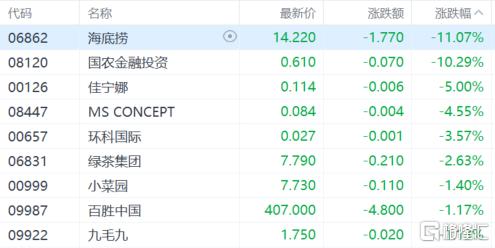 餐饮股跌幅居前,海底捞跌超11%,国农金融投资跌超10%,佳宁娜、绿茶集团、小菜园等跟跌。