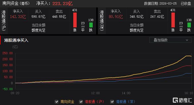 今日,南向资金净买入223.23亿港元,其中港股通(沪)净买入142.32亿港元,港股通(深)净买入80.91亿港元。