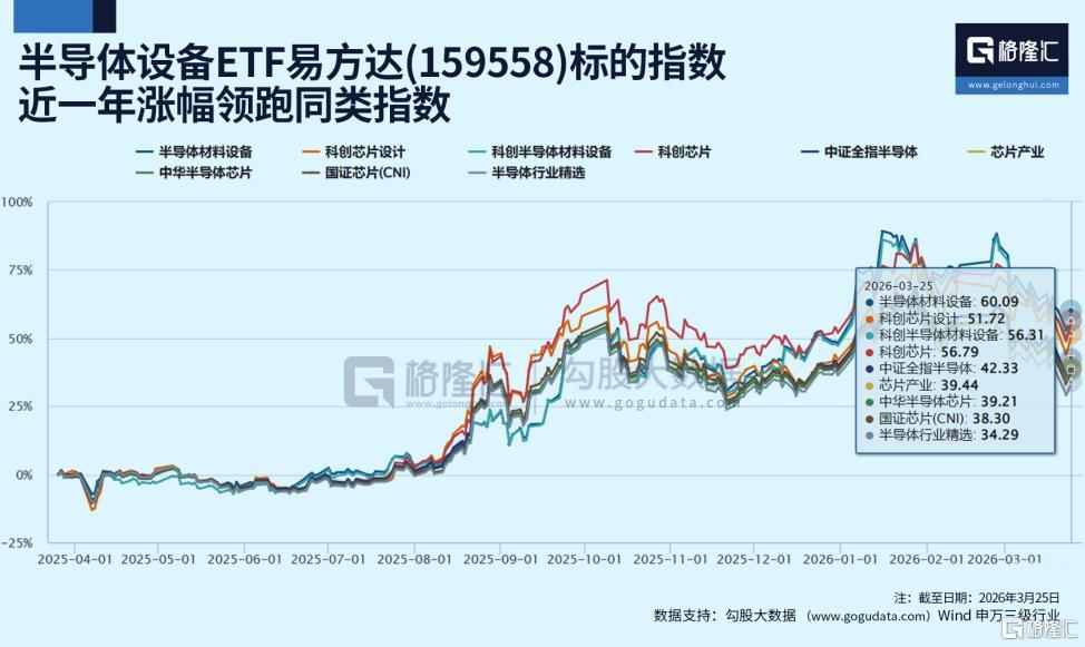 半导体设备ETF易方达(159558)涨3.23%,科创芯片设计ETF易方达(589030)涨2.84%。这一波半导体板块上涨中,聚焦上游的半导体材料设备近一年涨幅领跑同类指数。