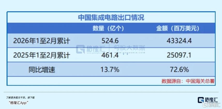 2026年1-2月,我国集成电路出口额达到433.2亿美元,同比猛涨72.6%,但出口量只涨了13.7%。这一对比就很明显了,那就是“价”的贡献要高于“量”。