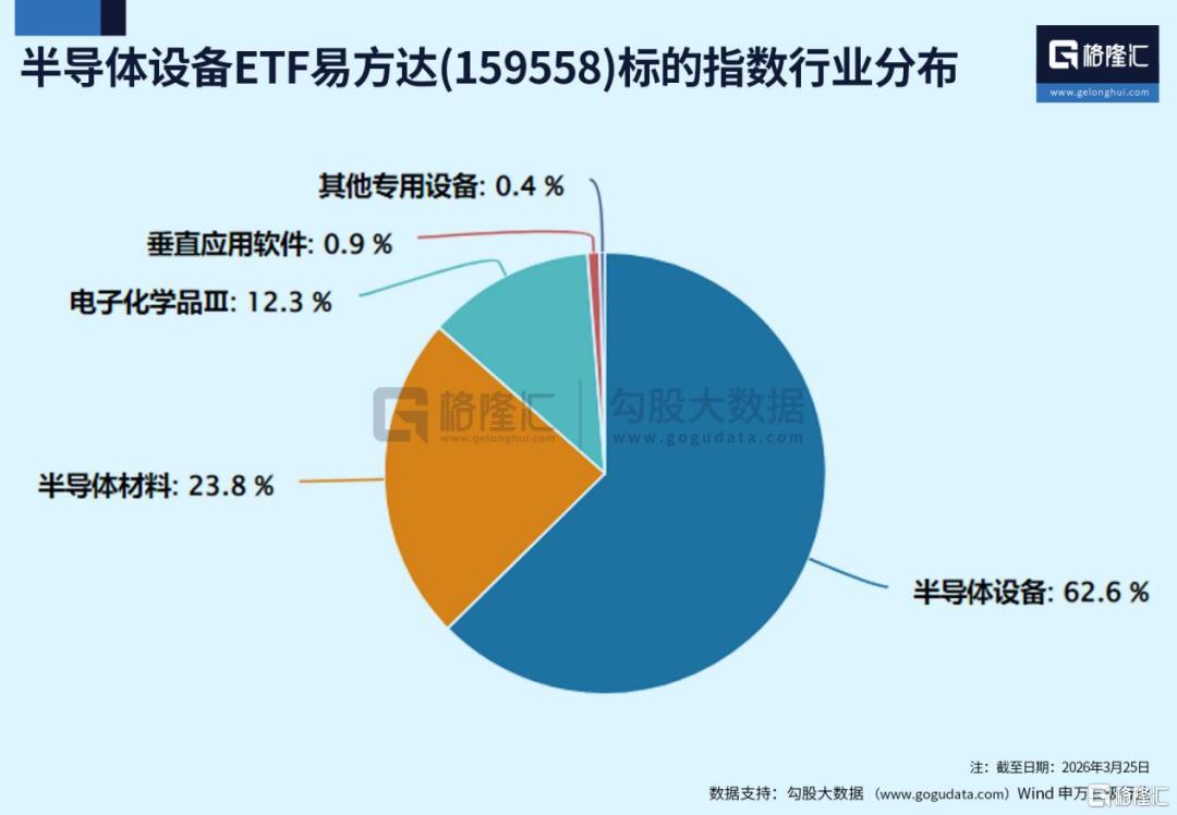 半导体设备ETF易方达(159558)跟踪中证半导体材料设备主题指数,半导体设备占比62.6%、半导体材料占比23.8%,成份股覆盖光刻机、蚀刻机、薄膜沉积设备及硅片、光刻胶等关键环节龙头企业,北方华创 中微公司权重超26%,契合国产替代的时代旋律。