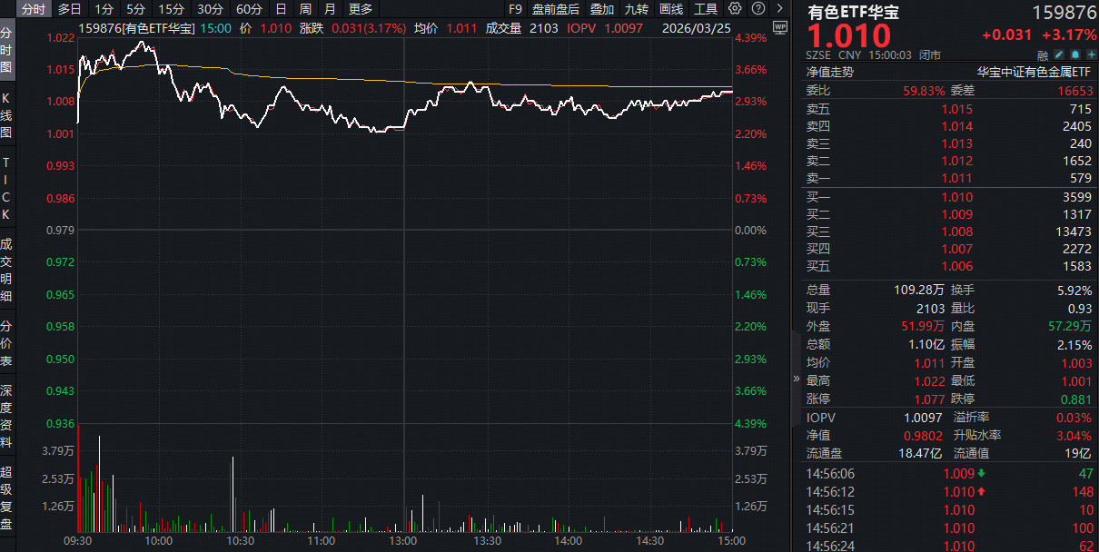 或由于中东地缘事件出现关键拐点信号,周三(3月25日)现货黄金直线拉升冲上4500美元,全面覆盖黄金、稀土、铜铝等有色金属行业龙头的有色ETF华宝(159876)场内涨幅最高上探4.29%,收涨3.17%,一举收复5日均线和半年线,值得一提的是,资金加速低位布局,该ETF全天获资金净申购360万份