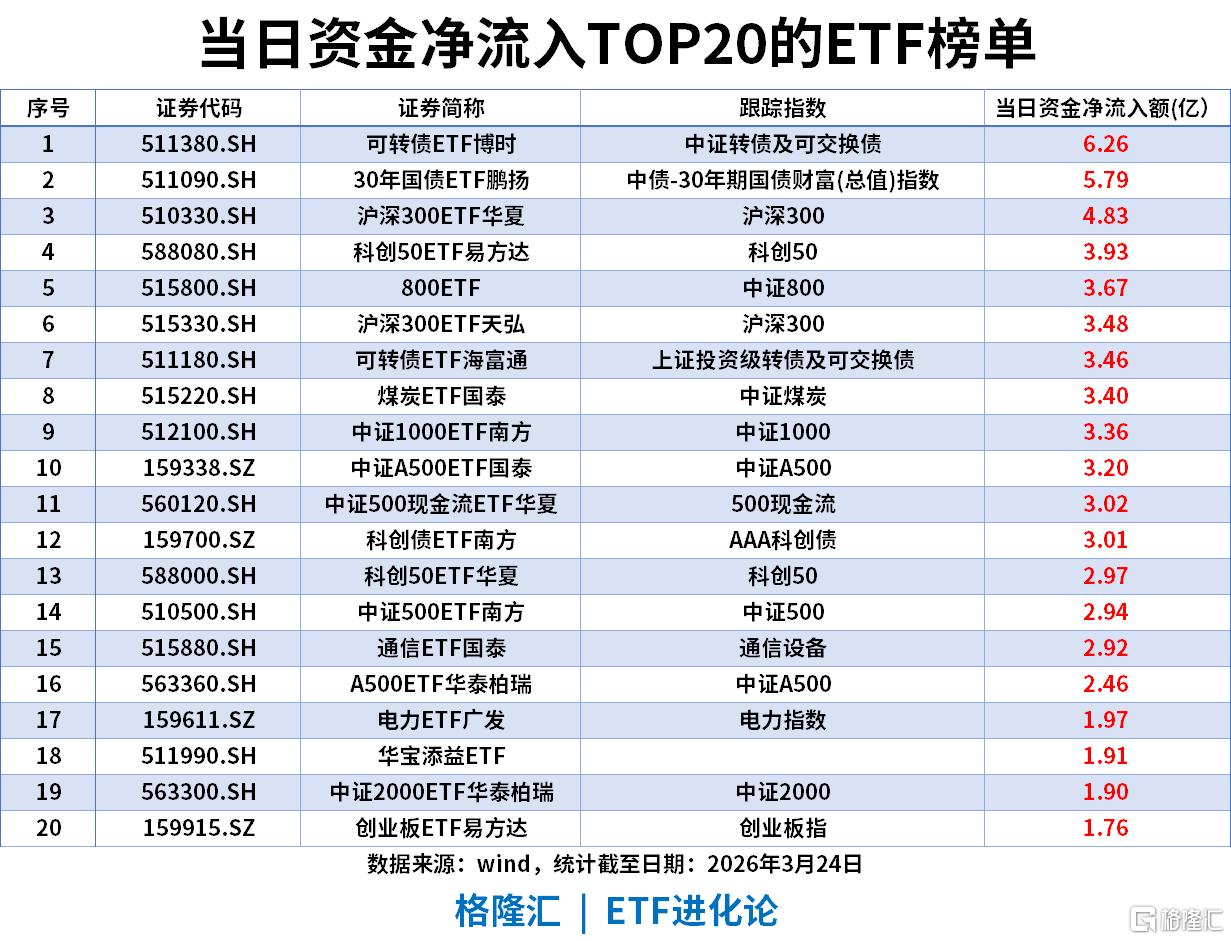 固收类资产是当日资金的绝对首选,可转债ETF博时、30年国债ETF鹏扬分别以6.26亿、5.79亿净流入领跑,可转债、国债、科创债等低风险品种同步获资金加仓。