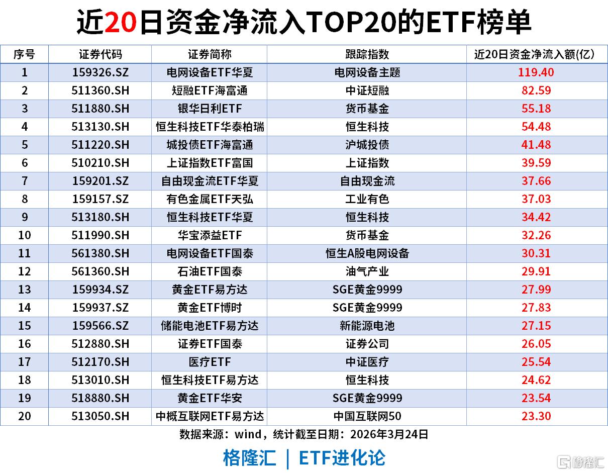 能源主线、固收避险、港股科技成为三大核心资金流向。电网设备ETF华夏以119.40亿净流入登顶榜首,能源电力板块获资金大额中长期布局。