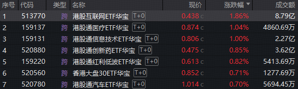 港股方面,一篇名为《外卖大战该结束了》的文章点燃港股热情,消息一出,美团、阿里巴巴等互联网巨头火速上攻,港股互联网ETF华宝(513770)盘中冲高逾3%,自本轮回调低点连续反弹,站上5日线。此外,聚焦港股硬科技的港股通信息技术ETF华宝(159131)、高CXO含量的港股通医疗ETF华宝(159137)继续反弹逾1%。
