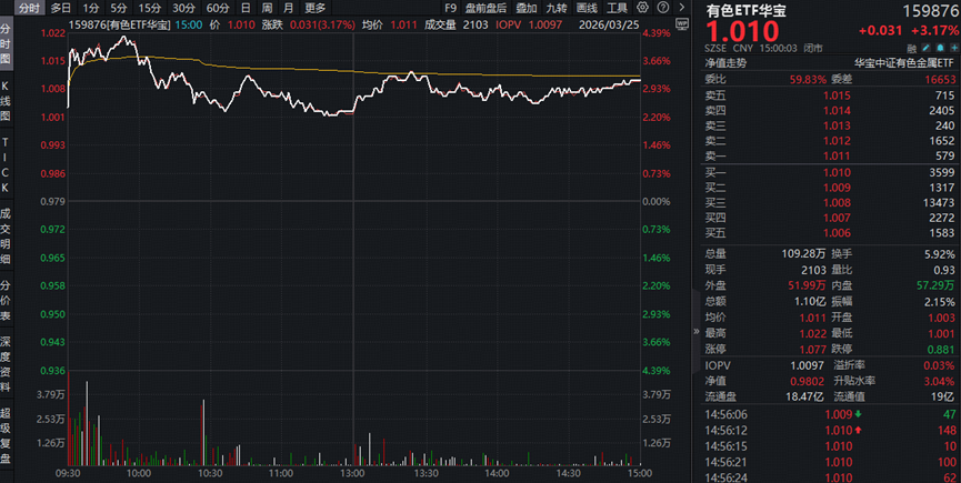 或由于中东地缘事件出现关键拐点信号,现货黄金直线拉升冲上4500美元,全面覆盖黄金、稀土、铜铝等有色金属行业龙头的有色ETF华宝(159876)场内涨幅最高上探4.29%,收涨3.17%,一举收复5日均线和半年线,值得一提的是,资金加速低位布局,该ETF全天获资金净申购360万份。