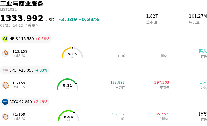 标普全球 (SPGI) 盘中下跌4.38%, 所属行业工业与商业服务下跌0.24% ,公司涨幅跑输行业涨幅,行业成交额前三股票 Nebius Group NV (NBIS) 上涨 0.58%;标普全球 (SPGI) 下跌 4.38%;沛齐 (PAYX) 上涨 2.46%。