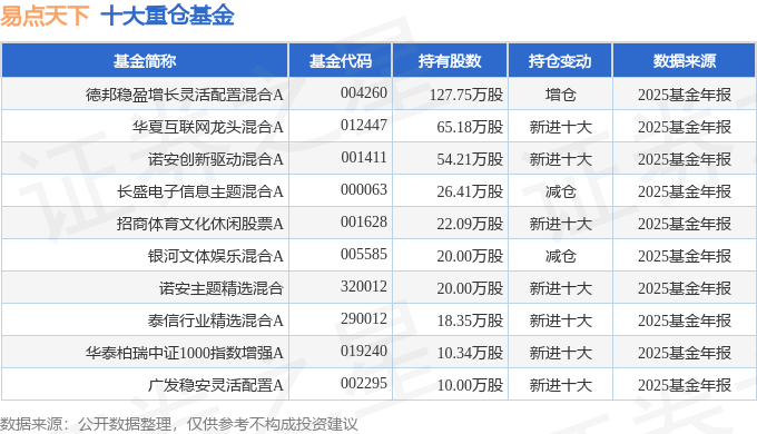 持有易点天下最多的基金为德邦稳盈增长灵活配置混合A,目前规模为0.46亿元,最新净值1.0078(3月25日),较上一交易日上涨2.76%,近一年上涨0.92%。该基金现任基金经理为雷涛 陆阳。