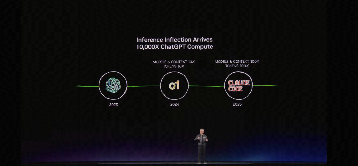在GTC大会上,一个深刻的感受是:英伟达更愿将自己定位为“算法公司”,而非单纯的芯片供应商。黄仁勋在演讲中勾勒出AI演进的三级跳——2023年ChatGPT开启生成式AI时代,2024年推理模型将算力消耗推升至10倍,2025年AI Agent则带来千倍级跃升。