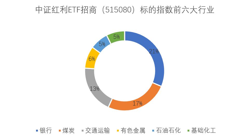 资料显示,中证红利ETF招商(515080跟踪中证红利指数,前六大重仓行业分别为银行(21%)、煤炭(17%)、交通运输(13%)、有色金属(6%)、石油石化(5%)和基础化工(5%)——较为聚焦HALO资产,周期含量约四成。