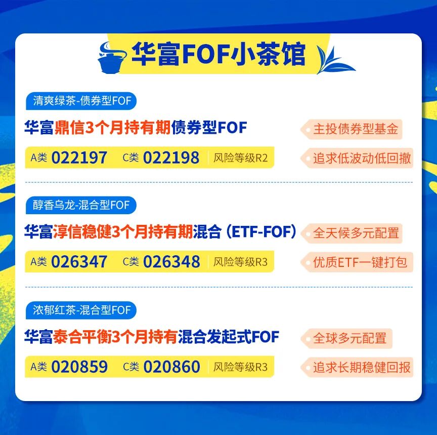 华富鼎信3个月持有期债券型FOF(A类 022197 / C类 022198)是一款低波固收 产品,主要投资债券型基金,追求低波动低回撤,遵循多元资产配置的理念,在严控回撤的前提下力争获取绝对收益。