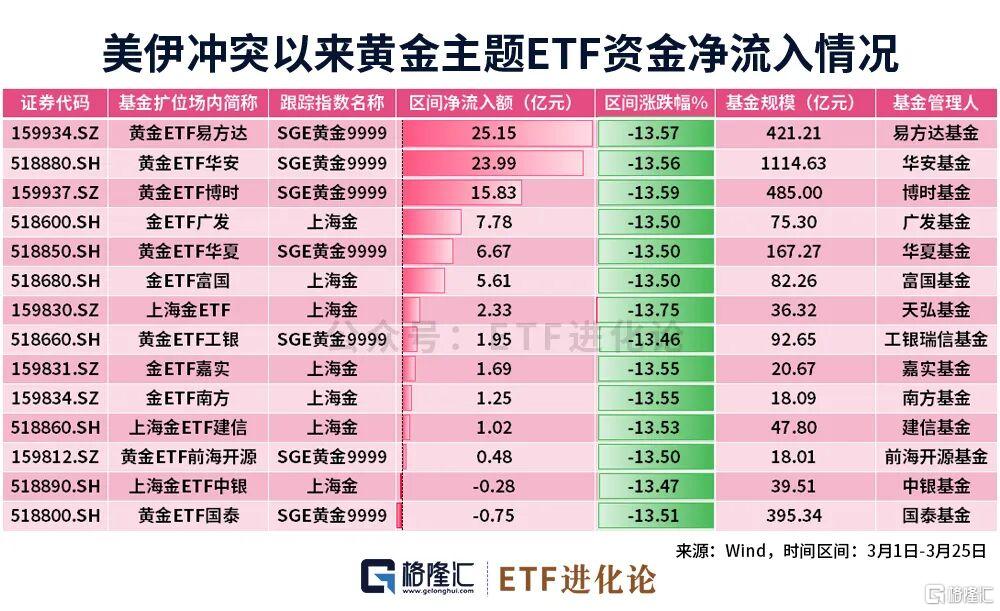 美伊冲突以来,截至3月25日,A股黄金主题ETF普遍下跌13%,但资金选择越跌越买,黄金ETF易方达、黄金ETF华安、黄金ETF博时分别净流入25.15亿元、23.99亿元和15.83亿元。