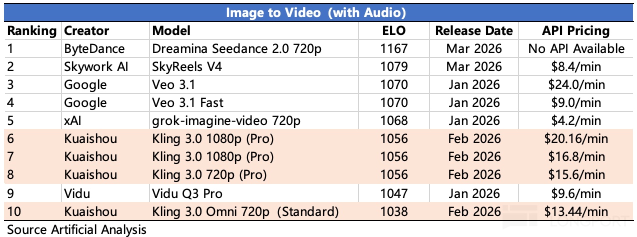 最新的可灵 3.0,走的是较高定价的专精路线(更多的偏向企业级专业领域用户),优势是多模态输入输出 全模态指令编辑控制,同时能够生成 120s 时长、高动态、擅长叙事的视频,这并不能完全体现到下图的 ELO 分数中,相比此前出圈的高性价比版本(比如 2.0、2.6 版本)是一种差异化布局。
