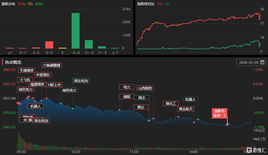 3月26日,A股三大指数集体下挫,全市场成交额1.96万亿元,近4500股下跌。板块方面,锂矿、能源金属股逆市走强,光伏设备、光伏发电股走低。