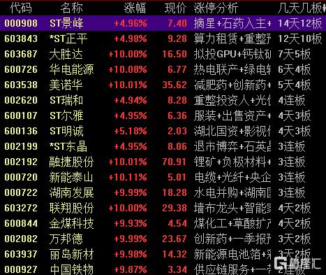 高位股方面,电力股华电能源6天4板,并购重组的大胜达7天5板,减肥药概念股美诺华5天4板。