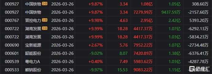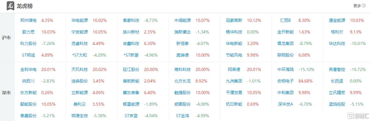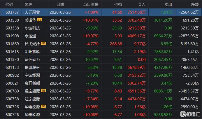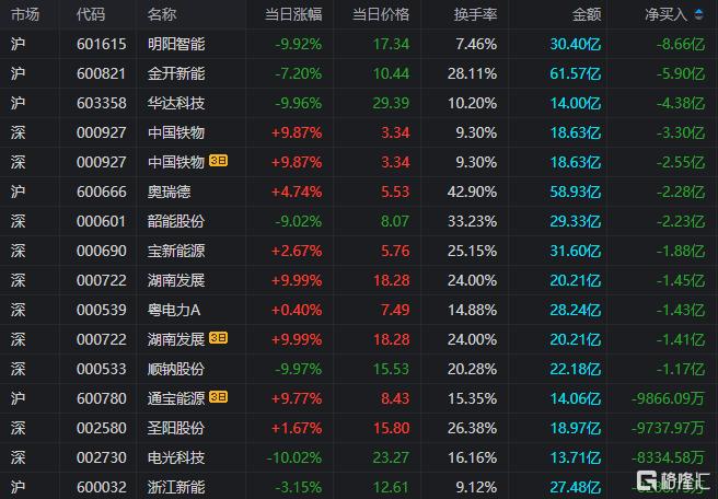 龙虎榜单日净卖出额前三为明阳智能、金开新能、华达科技,分别为8.66亿元、5.9亿元、4.38亿元。