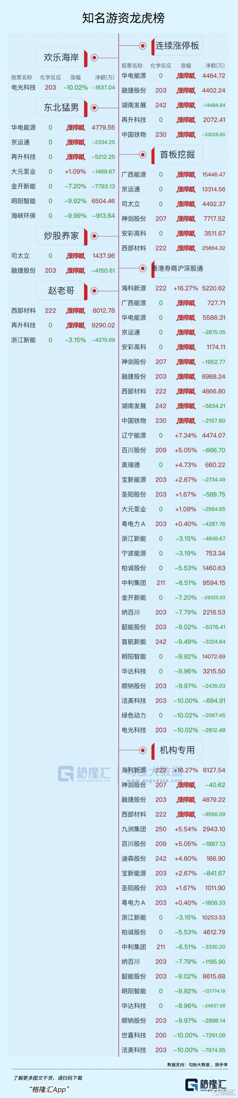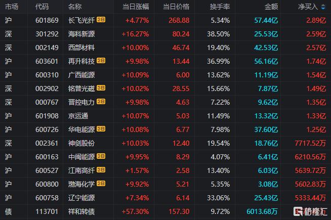 龙虎榜单日净买入额前三为海科新源、西部材料、广西能源,分别为2.59亿元、2.57亿元、1.54亿元。