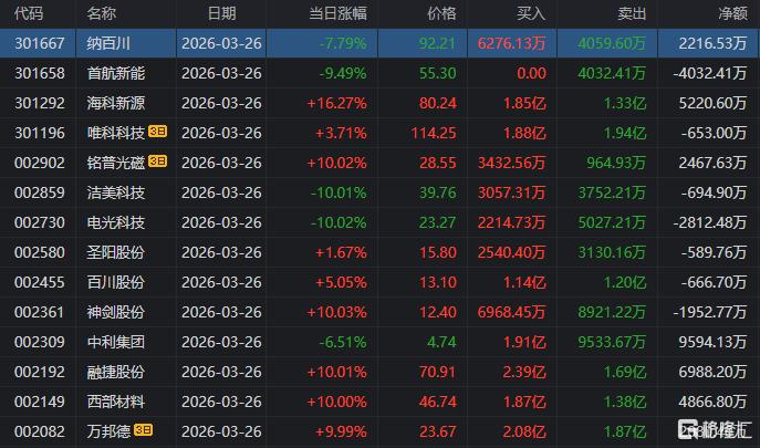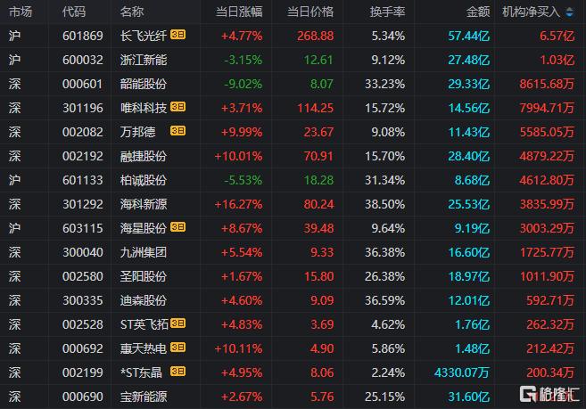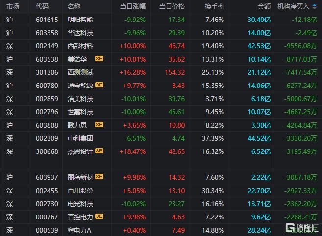 龙虎榜中涉及机构专用席位的个股中,当日净卖出额前三为明阳智能、华达科技、西部材料,分别为12.18亿元、2.49亿元、9556.08万元。