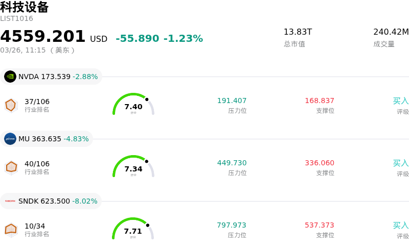 超威半导体 (AMD) 盘中下跌5.54%, 所属行业科技设备下跌1.23% ,公司涨幅跑输行业涨幅,行业成交额前三股票 英伟达 (NVDA) 下跌 2.88%;美光科技 (MU) 下跌 4.83%;闪迪 (SNDK) 下跌 8.02%。