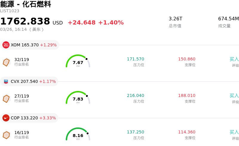 瓦莱罗能源 (VLO) 收盘上涨5.61%, 所属行业能源 - 化石燃料上涨1.40% ,公司涨幅跑赢行业涨幅,行业成交额前三股票 埃克森美孚 (XOM) 上涨 1.29%;雪佛龙 (CVX) 上涨 1.17%;ConocoPhillips (COP) 上涨 3.33%。