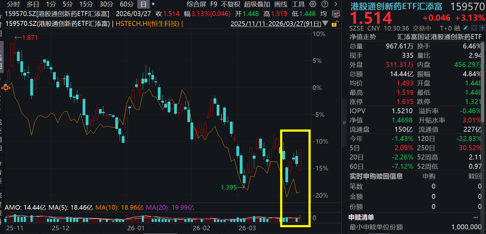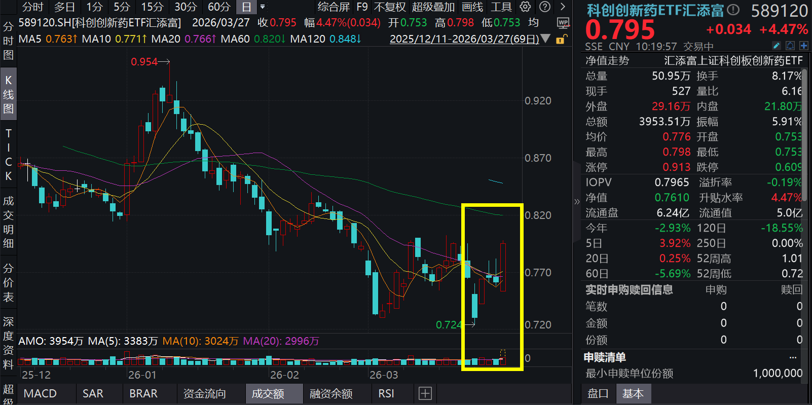 3月27日,A股市场震荡,科创创新药板块再次冲高!截至10:10,科创创新药ETF汇添富(589120)强劲飙升,涨超4%!港股通创新药ETF汇添富(159570)涨超3%!