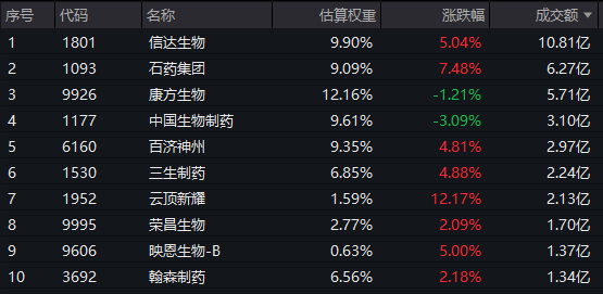 港股通创新药ETF汇添富(159570)标的指数热门股多数飘红:云顶新耀涨超12%,石药集团涨超7%,信达生物涨超5%,百济神州、三生制药涨超4%,荣昌生物涨超2%。