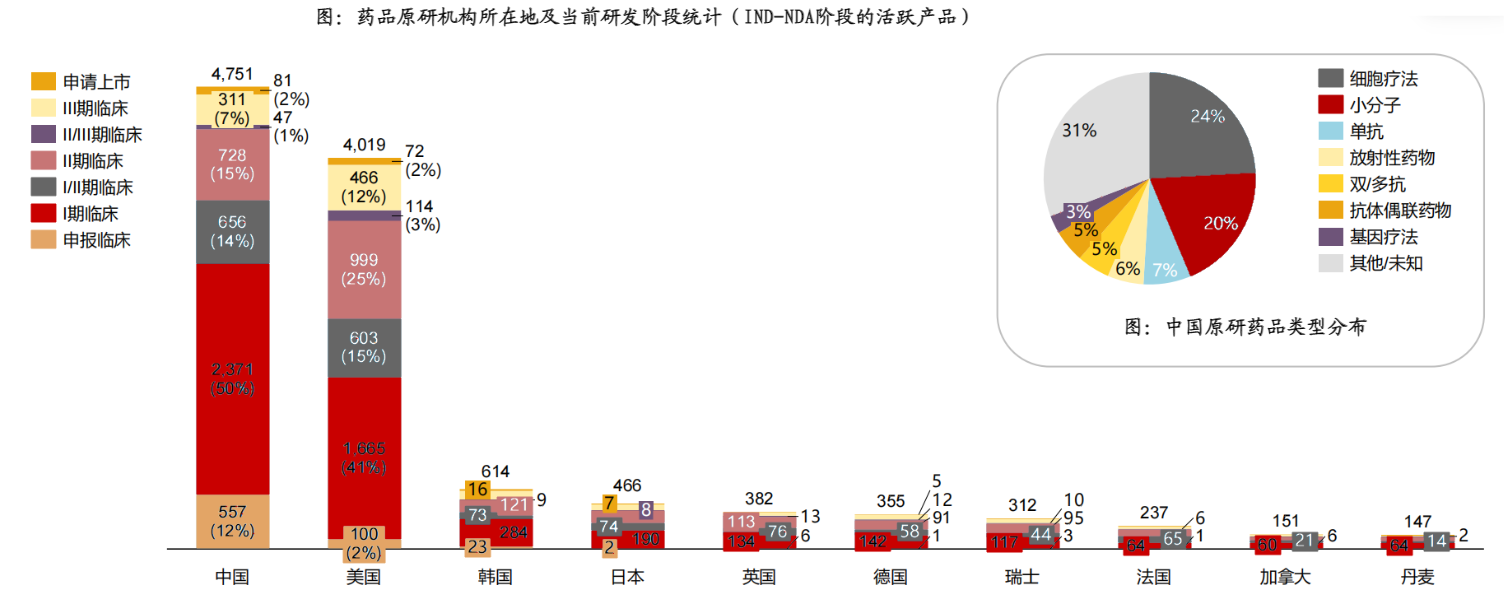从数据看,截至2025年底中国企业在研创新药数量已位居第一,全球占比33.7%。截至2025年底,全球在研(研发阶段处于申报临床-申请上市)且研发状态活跃的创新药共14088个,中国企业原研药品数量4751个(占比33.7%),超过美国(4019个,28.5%),排名第一。中国原研产品76%处于早期研发阶段,以细胞疗法和小分子为主,占比分别为24%和20%,放射性药物、双/多抗、抗体偶联药物等产品占比约为5%。