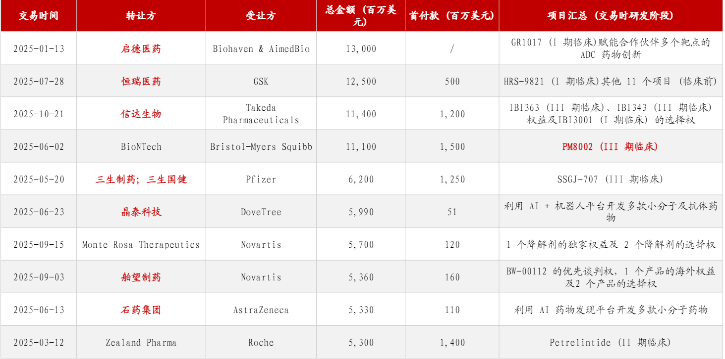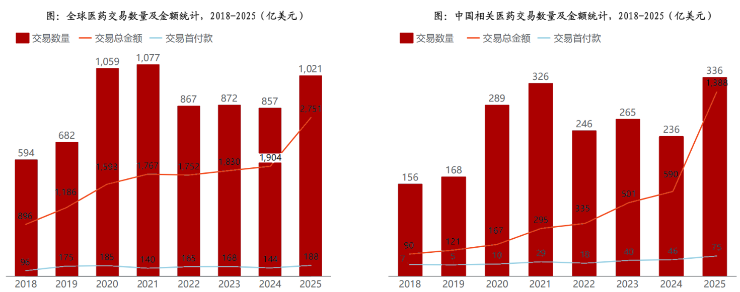 2025年全球医药交易持续活跃,中国license-out交易爆发。2025年,全球范围内医药交易数量和交易金额大幅增加,交易数量达1021笔( 19%),接近2020-2021年水平;总交易金额增至2751亿美元( 31%),首付款为188亿美元( 45%),均打破历史记录中国相关交易与全球交易趋势一致,2025年中国相关交易数量为336笔( 42%),交易总金额爆发式增长,总交易金额提升至1388亿美元( 135%),首付款增至75亿美元( 63%);2025年中国相关交易总金额约占全球交易总金额50%,几乎全部由license-out交易构成。