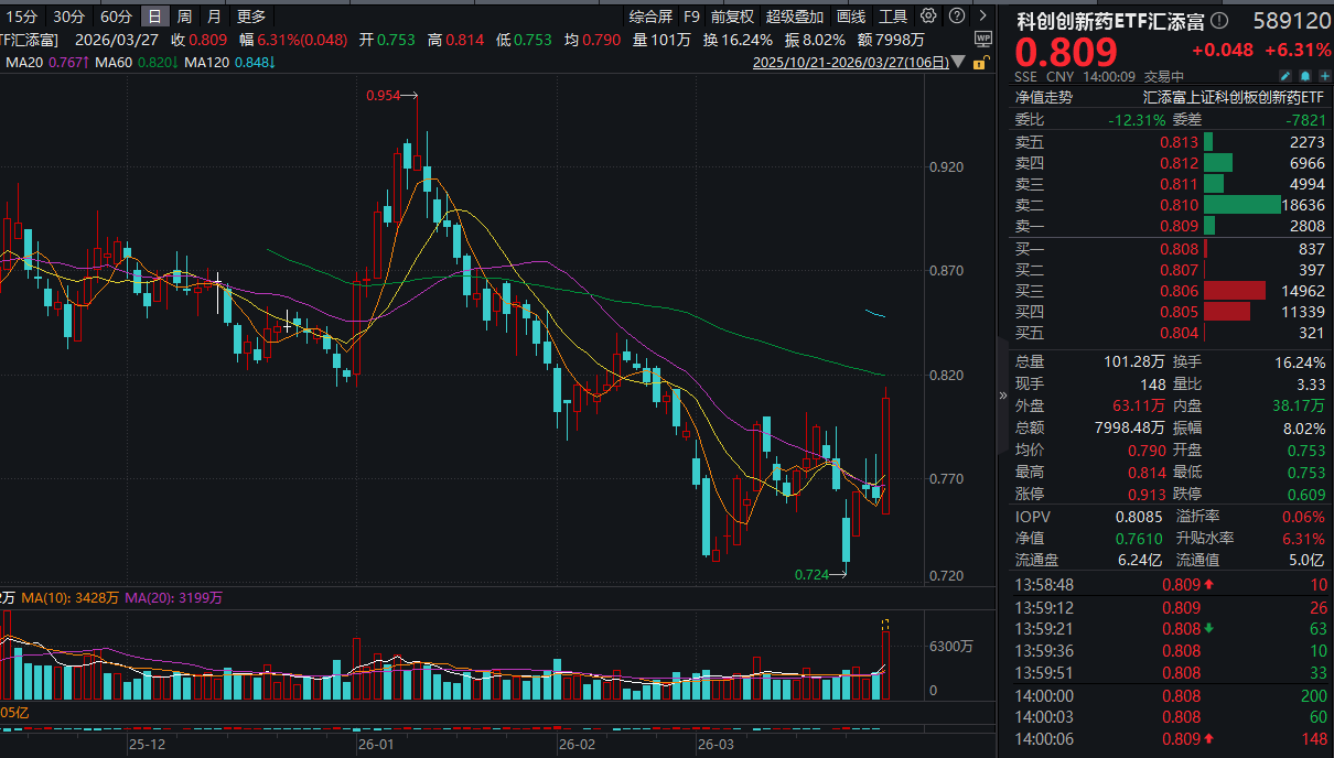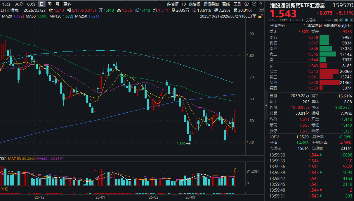 今日(3.27),创新药板块彻底沸腾,迎来惊天暴涨!创新药纯度100%的港股通创新药ETF汇添富(159570)大涨超5%,盘中放量成交超30亿元!“20CM创新药新物种” 科创创新药ETF汇添富(589120)暴涨超6%,涨幅位居全市场ETF前列!