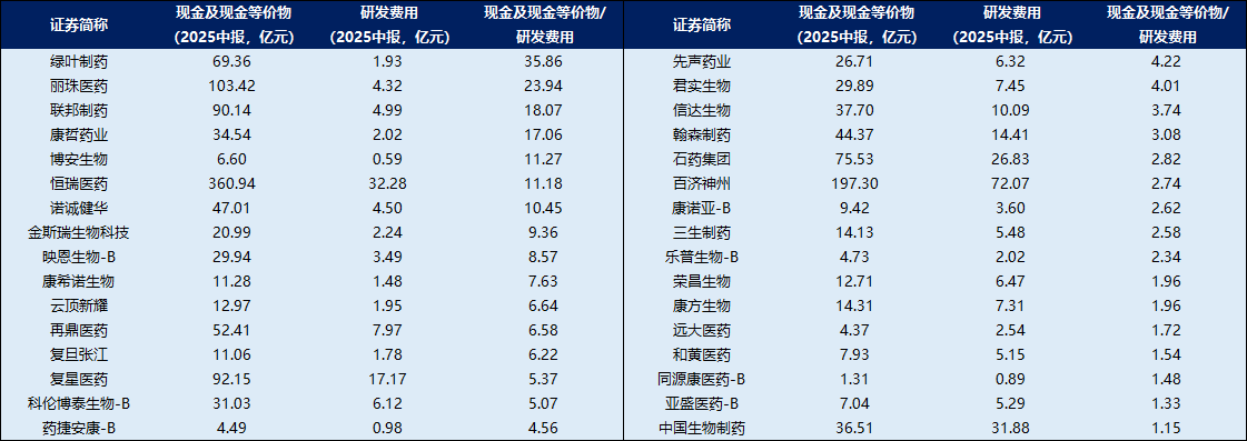 东吴证券通过计算“现金及现金等价物/年研发费用”来评估创新药板块的资金面是否充裕。整体而言,当前医药板块资金面充裕,绝大多数企业仍保持了1年以上的研发资金覆盖能力,能够有效支撑后续临床试验推进、管线拓展及技术创新,为行业长期高质量发展奠定了稳健的财务基础,也为创新药企业的技术突破与商业化转化提供了充足的时间窗口。