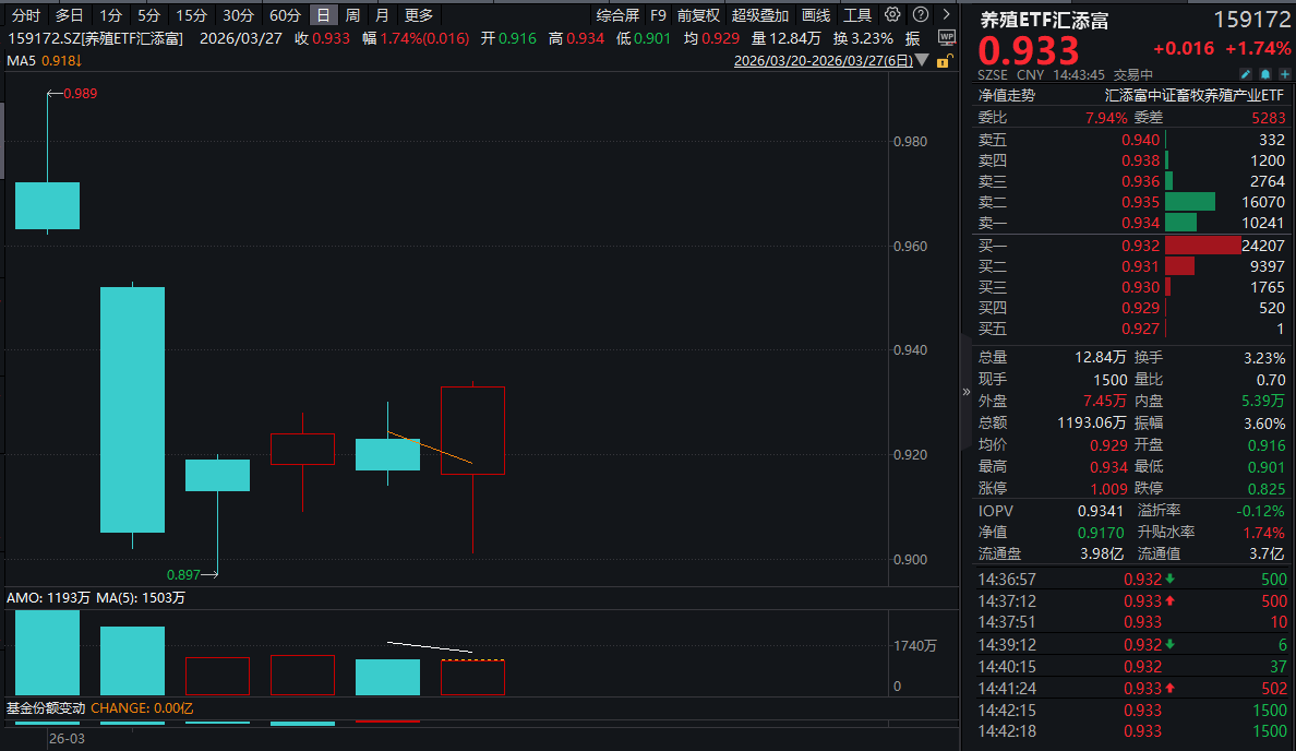 今日(3.27),A股强势反弹,全市场“含猪量”更高更纯的养殖ETF汇添富(159172)大涨近2%,盘中成交额快速突破1200万元!