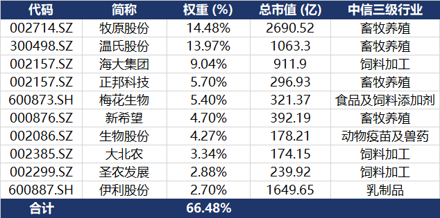 养殖ETF汇添富(159172)标的指数成分股集中度高,囊括各细分领域龙头。截至2026年2月28日,中证畜牧养殖产业指数前十大权重股占比合计为66.47%。其中权重占比最高的是牧原股份和温氏股份,分别占比14.48%和13.97%,均为A股生猪养殖领域“一哥”;此外,重仓股还包括饲料加工龙头海大集团(占比9.04%)、大北农(3.34%),以及乳制品龙头伊利股份(2.70%)。