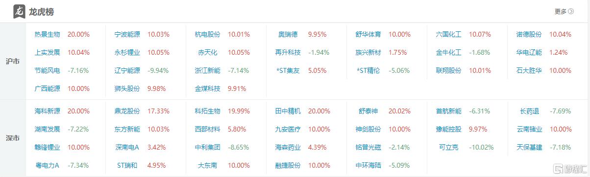 龙虎榜单日净买入额前三为赣锋锂业、东方新能、舒泰神,分别为8.23亿元、4.91亿元、2.79亿元。