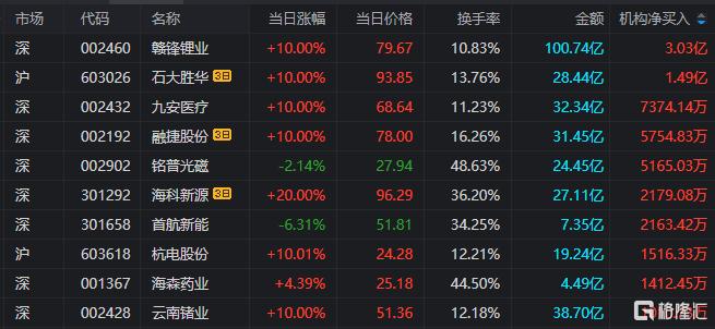 赣锋锂业:今日涨停,全天换手率10.86%,成交额100.74亿元,振幅11.44%。机构净买入3.03亿元,深股通净买入7904.91万元,营业部席位合计净买入4.40亿元。