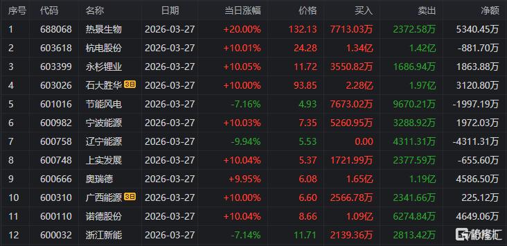 龙虎榜中涉及机构专用席位的个股中,当日净卖出额前三为中利集团、鼎龙股份、海科新源,分别为6.07亿元、4.43亿元、2403.91万元。