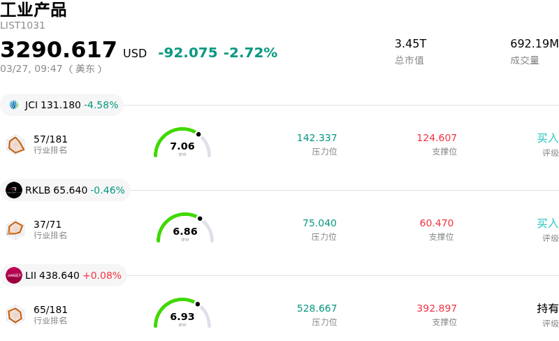 通用电气 (GE) 开盘下跌4.64%, 所属行业工业产品下跌2.72% ,公司涨幅跑输行业涨幅,行业成交额前三股票 江森自控 (JCI) 下跌 4.58%;Rocket Lab USA Inc (RKLB) 下跌 0.46%;Lennox International Inc (LII) 上涨 0.08%。