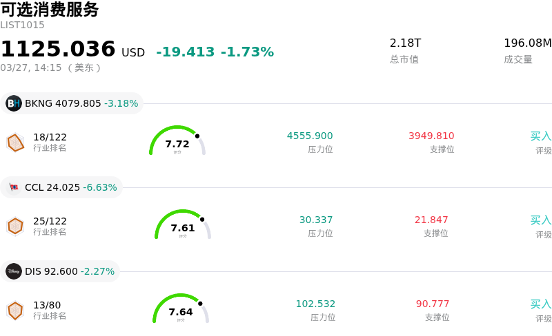 缤客 (BKNG) 盘中下跌3.18%, 所属行业可选消费服务下跌1.73% ,公司涨幅跑输行业涨幅,行业成交额前三股票 缤客 (BKNG) 下跌 3.18%;Carnival Corp (CCL) 下跌 6.63%;迪士尼 (DIS) 下跌 2.27%。